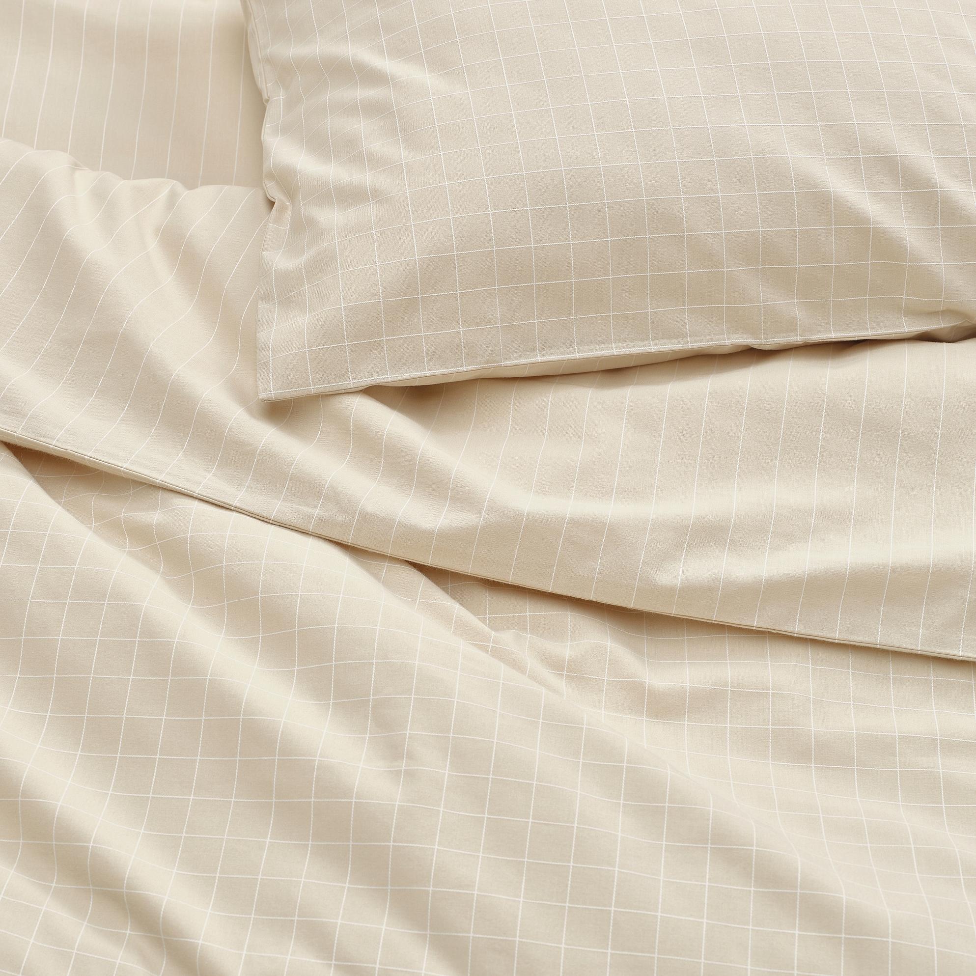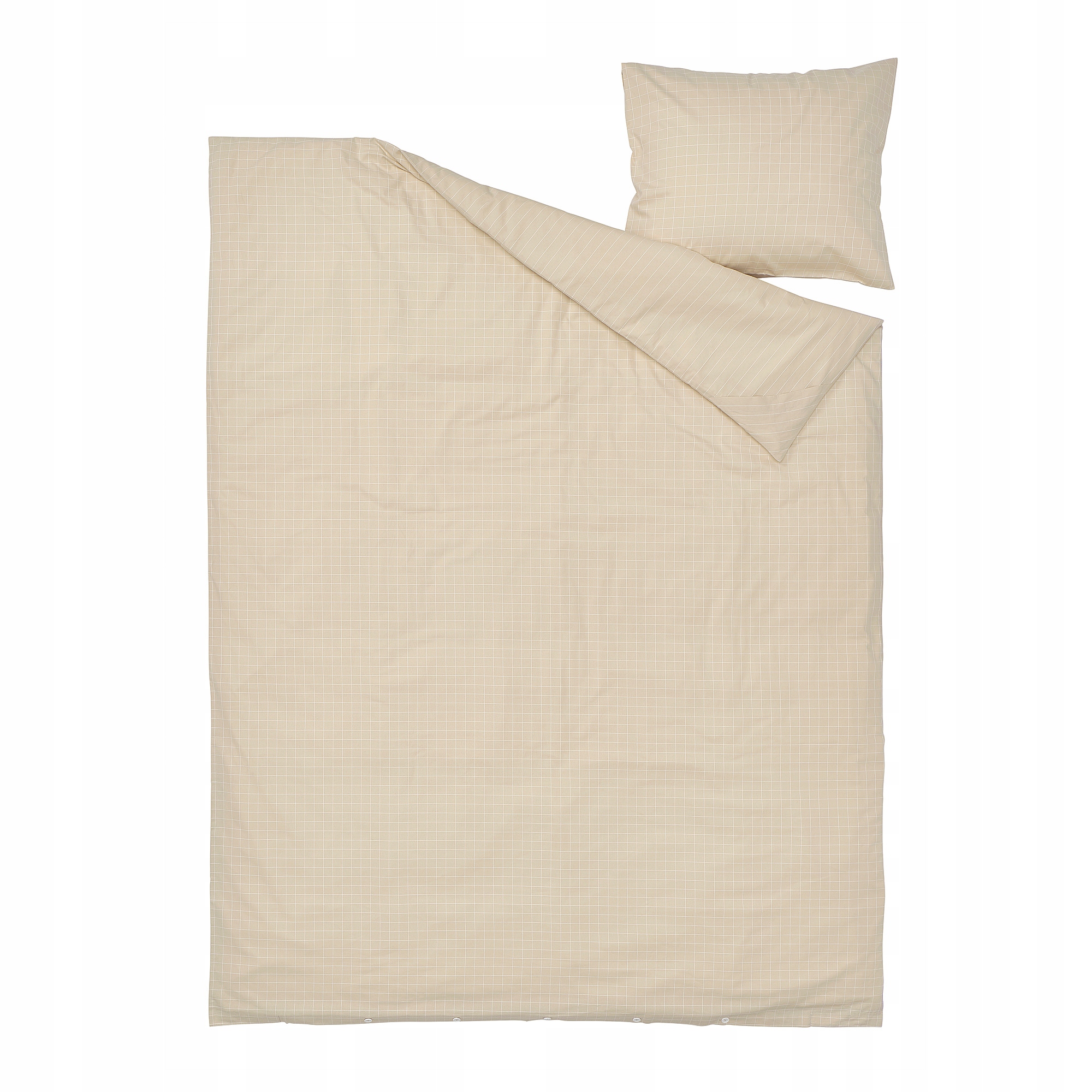 Komplet beżowo-antracytowej pościeli DOFTAKLEJA zdobi przeszycie w kratkę po jednej stronie i w paski po drugiej. Zakryte kieszonkami otwory w narożnikach ułatwiają wkładanie kołdry do poszwy.