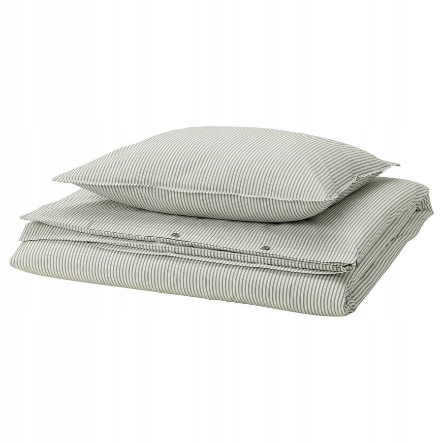 Pościel SOLFIBBLA jest wykonana z miękkiej, 100% bawełny, a barwiona przędza tworzy ponadczasowe zielono-białe pasy. Grubsza przędza tworzy w sypialni przytulną atmosferę z nutką rzemieślniczego uroku w stylu vintage.