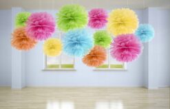 Pompony bibułowe to modne i delikatne ozdoby, które idealnie komponują się z innymi dekoracjami takimi jak girlandy, balony, rozety i kule bibułowe. Świetnie sprawdzą się przy ozdabianiu pokoju dziecięcego oraz jako dekoracja na przyjęciu urodzinowym, weselu i każdej innej imprezie.